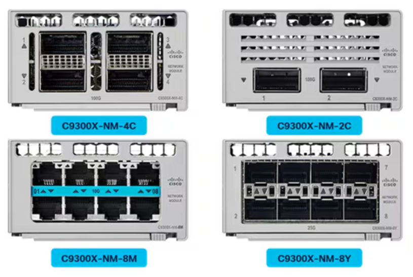 Cisco Catalyst 9300 Series switches (C9300X and C9300 SKUs) support optional network modules for uplink ports (Figure 2). These field-replaceable network modules with 25G and 40G speeds in the Cisco Catalyst 9300 Series enable greater architectural flexibility and infrastructure investment protection by allowing a nondisruptive migration from 10G to 25G and beyond. The default switch configuration does not include the network module. When you purchase the switch, you can choose from the network modules described in Table 2.