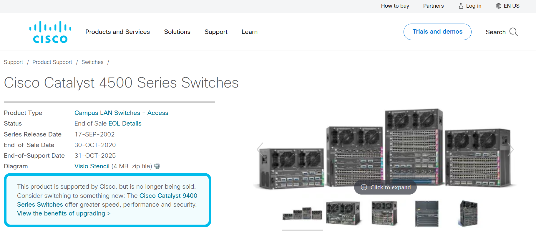 Mod Ports Card Type Model Serial No. ---+-----+--------------------------------------+------------------+----------- 1 8 Sup 8-E 10GE (SFP+), 1000BaseX (SFP) WS-X45-SUP8-E CAT2129L0F4 3 12 1000BaseX SFP WS-X4712-SFP-E CAT2107L62F 4 48 10/100/1000BaseT EEE (RJ45) WS-X4748-RJ45-E CAT2127L6TW