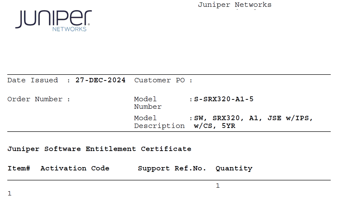 Licenses installed: License identifier: JUNOS422937473 License version: 4 Valid for device: CW4024AX0159 Customer ID: KDDI ASIA PACIFIC PTE. LTD. Features: idp-sig - IDP Signature date-based, 2024-12-27 00:00:00 UTC - 2030-01-26 00:00:00 UTC